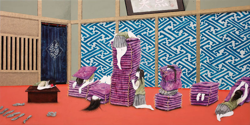 | Acrylic, watercolors, colored pencil on hemp cloth and panel 40.0 x 80.0cm |