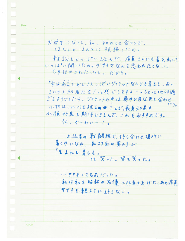 | 大学生になって、私、初めての合コンで、ほんとのほんとに頑張ったの。雑誌もいっぱい読んだ、店員さんにも勇気出していっぱい聞いたの。ダサイ女なんて思われたくない、ちやほやされたいって、だから。 「今はあえて(・・・)おじさんっぽいジャケットなんかを着ると、おっこいつ上級者だな!って感じしますよ〜。ちょっと地味過ぎるようでしたら、ジャケットの中は爽やか目な色を合わせたり。小物は、ハットを被ることで、長身効果や小顔効果も期待できるんで、これもおすすめです。うん、かーわいー!」 上級者の戦闘服で、待ち合わせ場所に着くやいなや、初対面の男の子が「生まれも育ちも」って笑った。皆も笑った。 …ササキって名前だった。私は私を昭和の名優に仕立て上げた、あの店員、ササキを絶対に許さない。 |