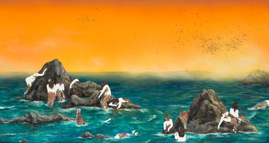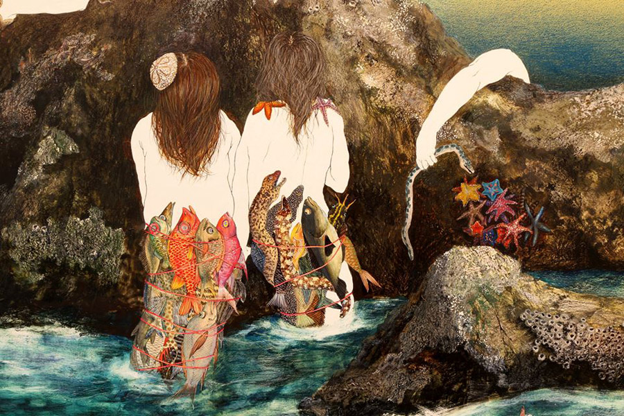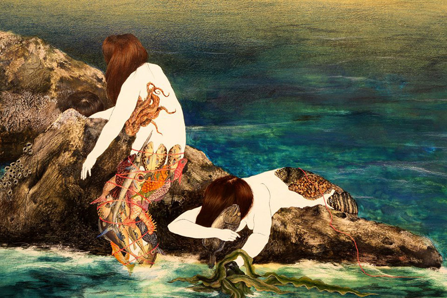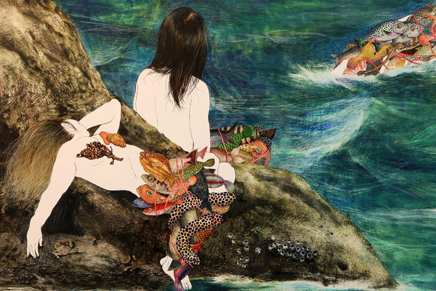 | Acrylic, watercolors, colored pencil, chalk ground on hemp cloth and panel 80 x 150cm |