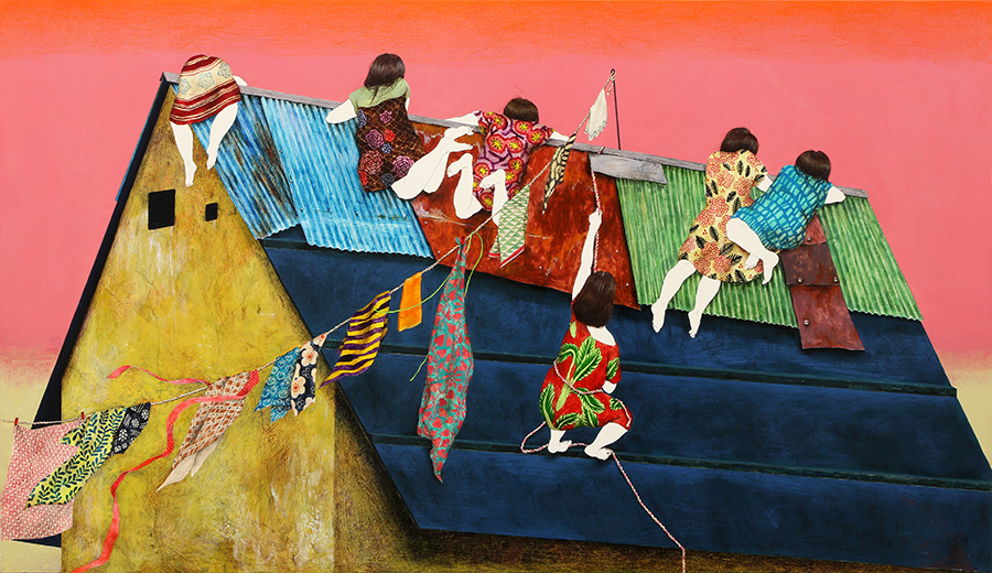 Acrylic, watercolors, colored pencil, chalk ground on hemp cloth and panel